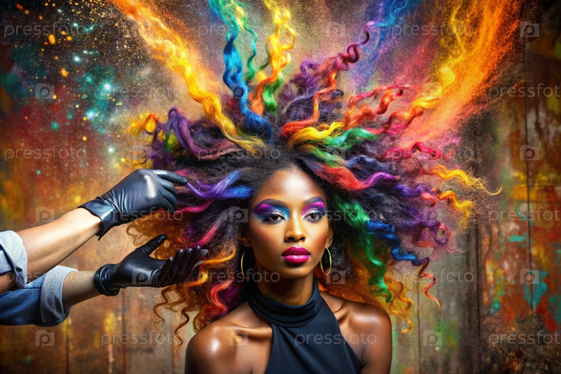 Творческий баннер для салона красоты или парикмахера. Модное профессиональное окрашивание волос. Красивая чернокожая афроамериканка с длинными многоцветными волосами. Взрыв цветов на голове