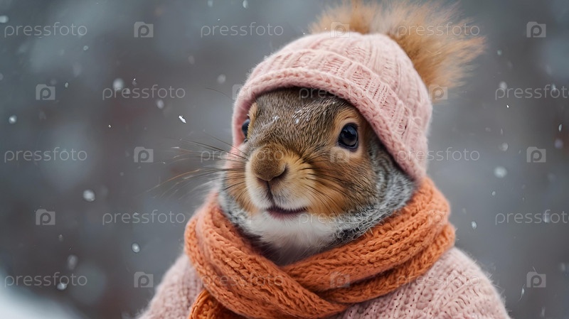 белка с большими щеками, одетая в уютную мягкую розовую тёплую одежду, шляпу и шарф на зимнюю тематику
