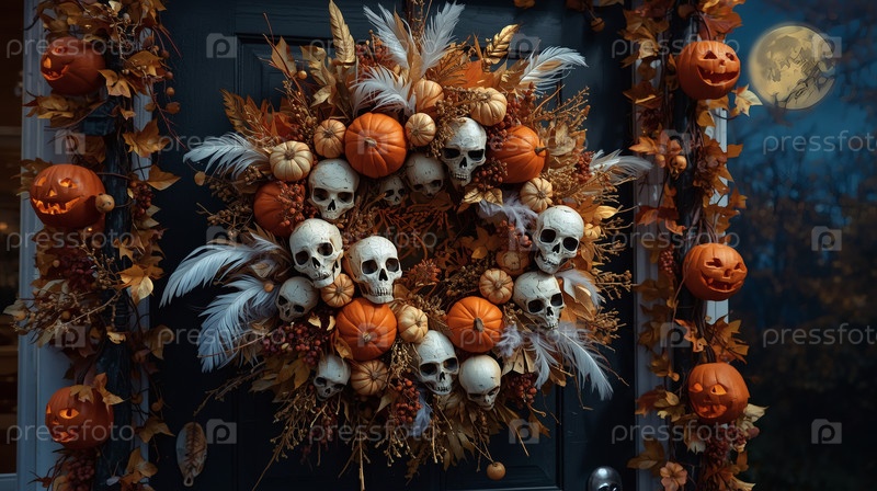 Ужасный венок на Хэллоуин из тыквен, черепов, белых и золотых осенних листьев и перьев