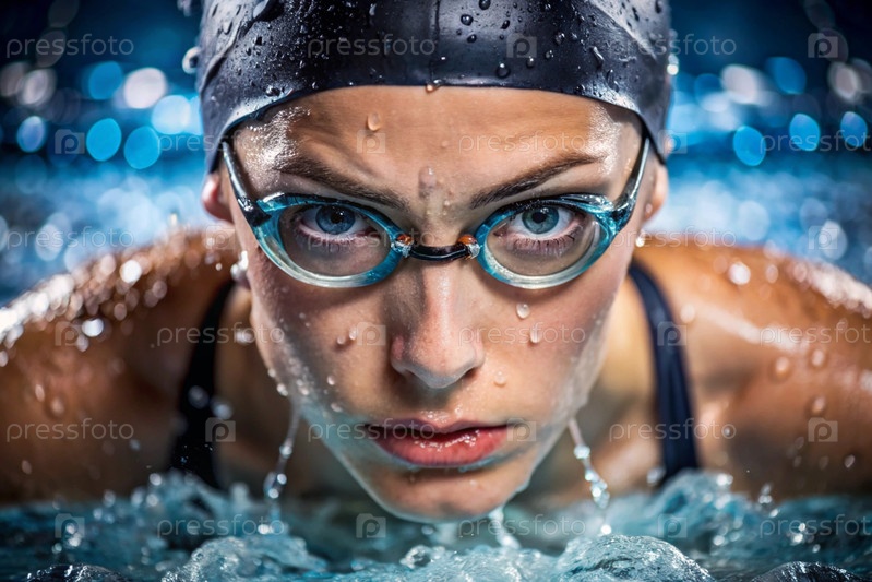Спортивное плавание. Женское плавание. Спортсменка, которая носит очки для плавания в бассейне во время соревнований на близком расстоянии. Женщина смотрит прямо в камеру
