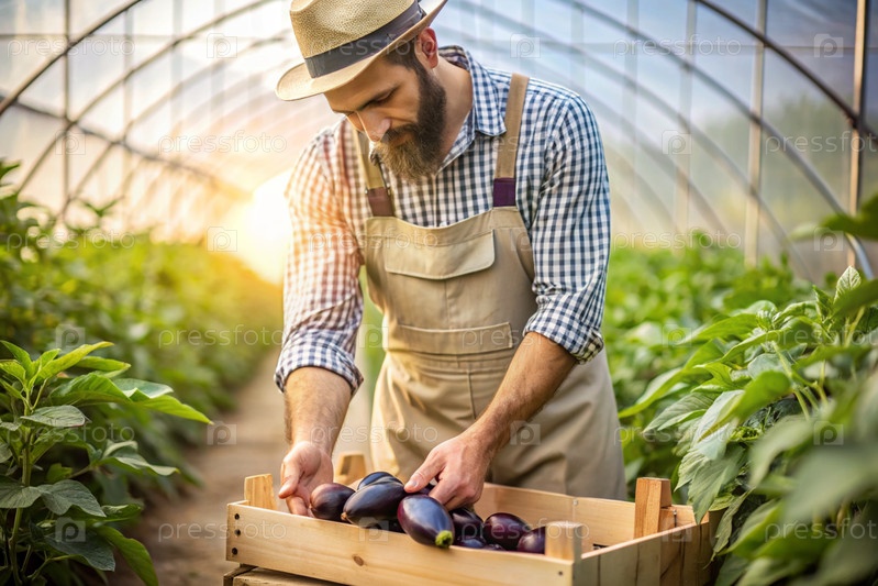 Сельскохозяйственная промышленность. деревянный ящик с баклажанами в руках фермера. садовник собирает богатый урожай в теплице