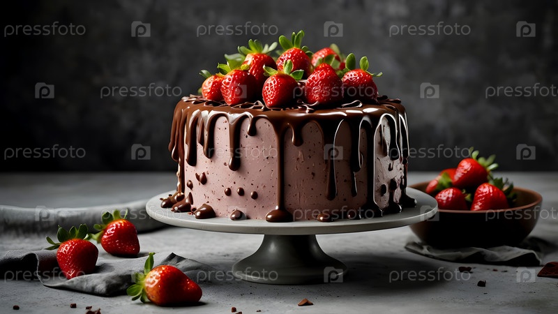 Концепция праздничных блюд. Пекарня. Красивый вкусный торт со свежими клубниками и шоколадом на столе. День рождения и сладости