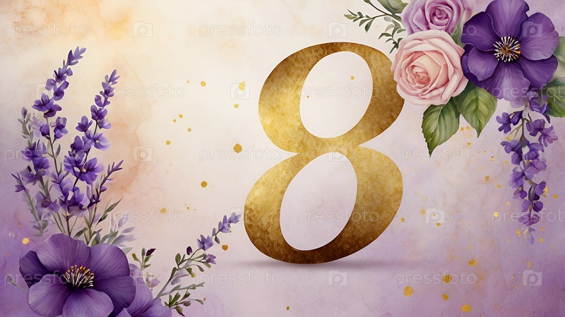 Международный женский день. праздник приходится на 8 марта. баннер, флаер. торжественный, нежный фиолетовый цветочный фон номер 8