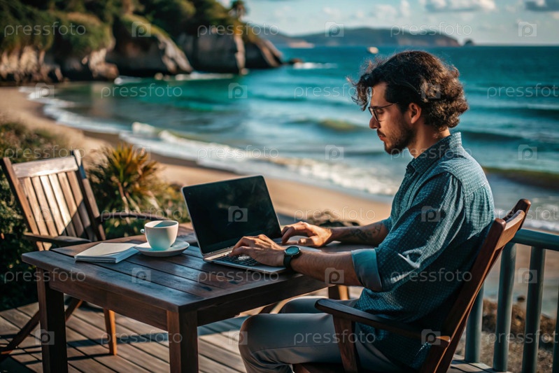 Молодой бизнесмен-фрилансер работает на ноутбуке, отдыхая у моря или делая покупки в Интернете