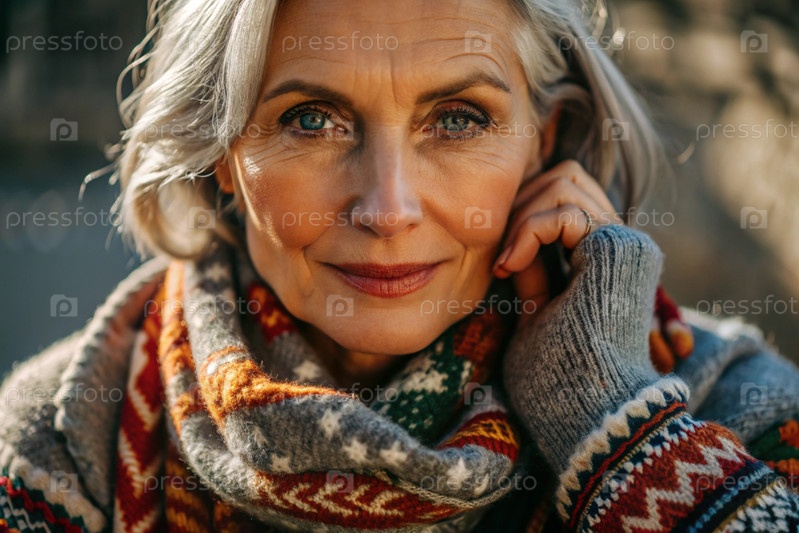 Осенний портрет красивой пожилой женщины, пенсионерки 70 лет. Она носит шарф с этническим узором и теплый свитер. Концепция жизни пожилых людей
