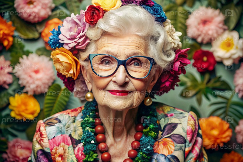Портрет стильной, модной пожилой женщины, пенсионерки 70 лет, которая носит очки и одежду с цветочными оттисками