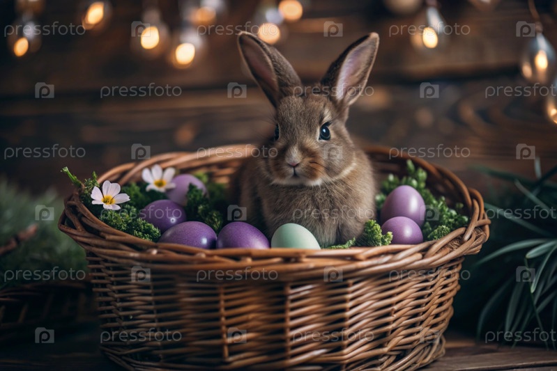Баннер. пасхальный кролик в корзине из красочных пасхальных яиц вокруг весенних снегопадов и первичной розы. концепция праздника Пасхи