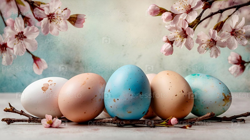 Нежные пасхальные яйца и вишневые ветви цветут на пастельном акварельном фоне с нежными полосками