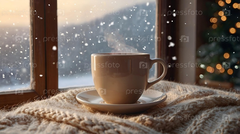 Чашка горячего какао или кофе на зимнем окне напитка испаряется.Уютное фото в нежных, теплых бежевых оттенках.Гармония и уютная концепция Рождества и зимы