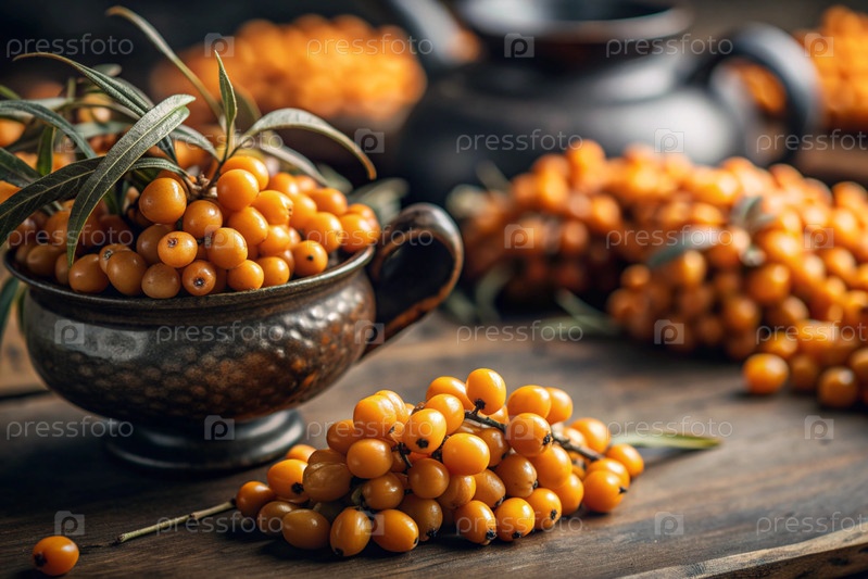 Здоровая, спелая ягода морского гречневого терна в ближайшем плане.Витамин, оранжевый, осенний, сезонный чай из ягод морского гречневого терна на темном фоне.Яблочный чай для иммунной системы