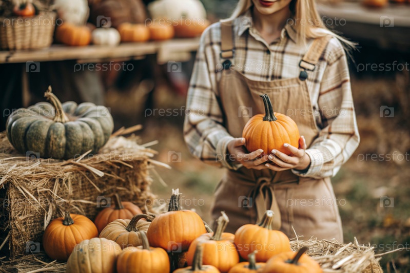 Руки женщины в квадратной рубашке с тыквенным крупным планом и красивым осенним рисунком. Сбор тыков. Концепция празднования Дня благодарения и Хэллоуина
