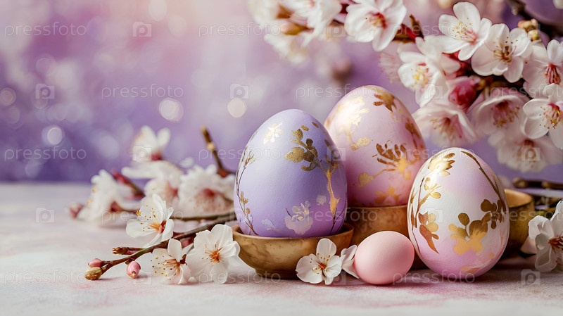 Нежные пасхальные яйца и вишневые ветви цветут на пастельном акварельном фоне с нежными полосками