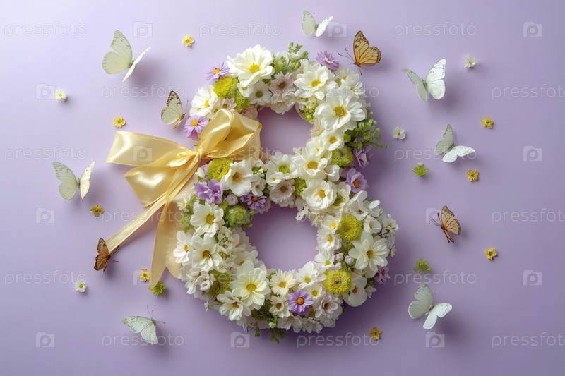 Международный женский день. баннер, флаер, красивая открытка на 8 марта. цветы в форме цифры восемь и бабочки на лиловом фоне