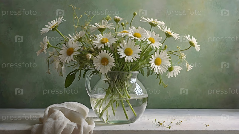 Легкий, воздушный букет маргариток в стеклянной вазе на пастельном фоне. Близко. Понятие семьи, любви и верности