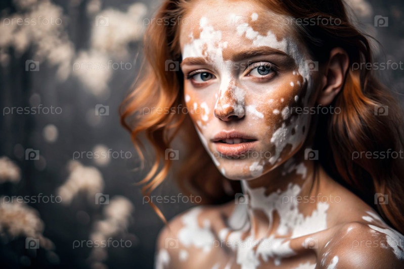 Лейкодермия. Витилиго. Плохая пигментация кожи. Большие белые пятна по всему телу и лицу. Портрет красивой девушки с кожными заболеваниями