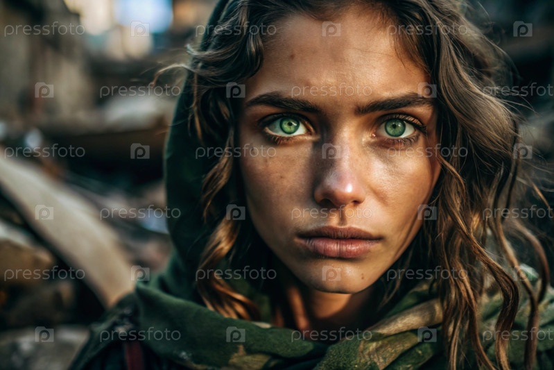 Голод, бедность.Портрет красивой грязной попрошайки с ярко выраженными зелеными глазами.Голодная бедная женщина смотрит в камеру