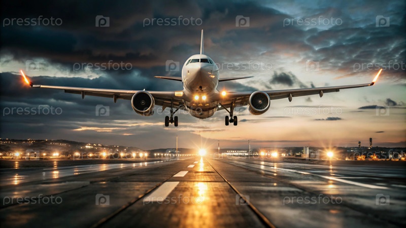 Авиалайнер готовится к взлету или посадке на взлетно-посадочной полосе аэропорта