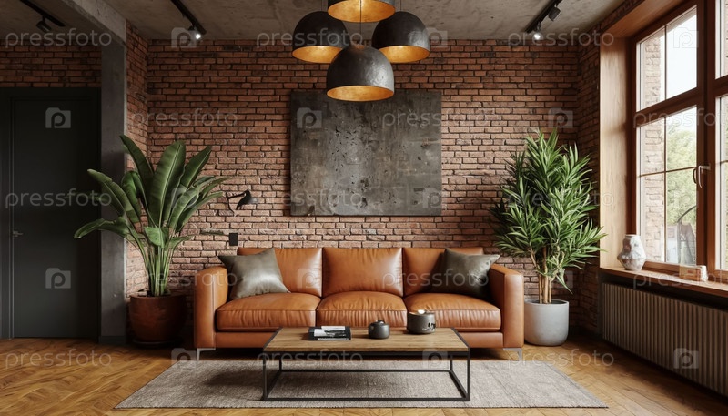 Современный интерьер гостиной с кожаным диваном