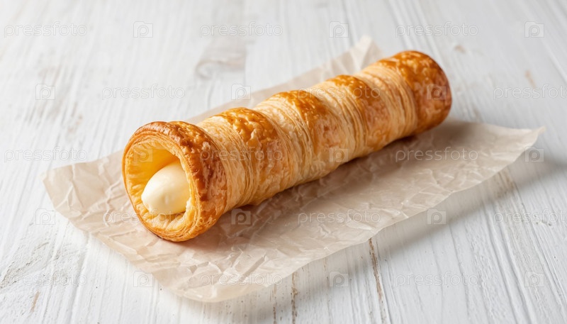 Торт из сливочной трубы на белом деревянном фоне