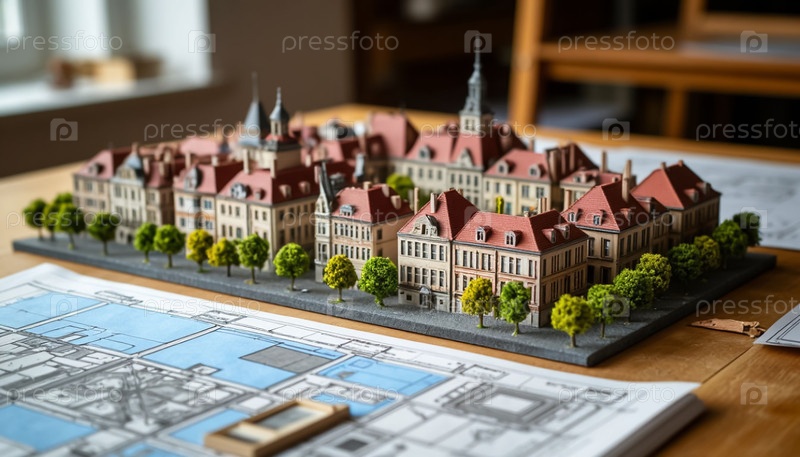 Модель жилого района на столе в архитектурном бюро