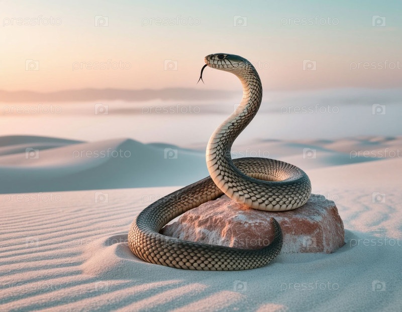 Змея в пустыне возле камня на белом песке на рассвете