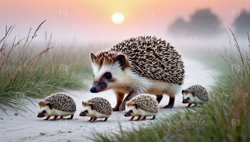 Мать ежа с детенышами идет по тропинке на рассвете