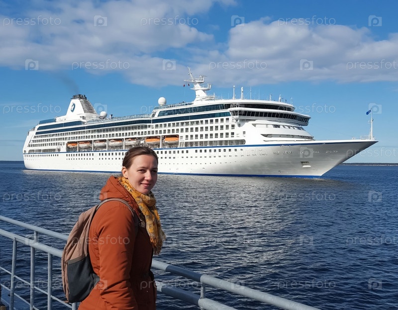 Девушка на берегу на фоне морского круизного судна