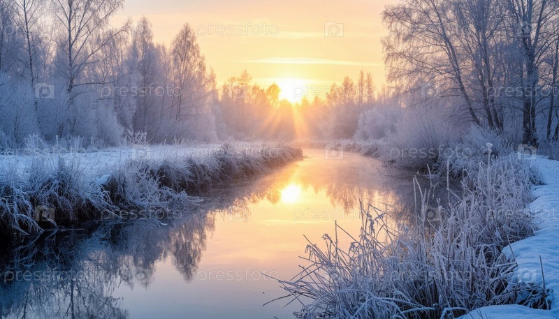 Зимний пейзаж, нежная рассвета на реке