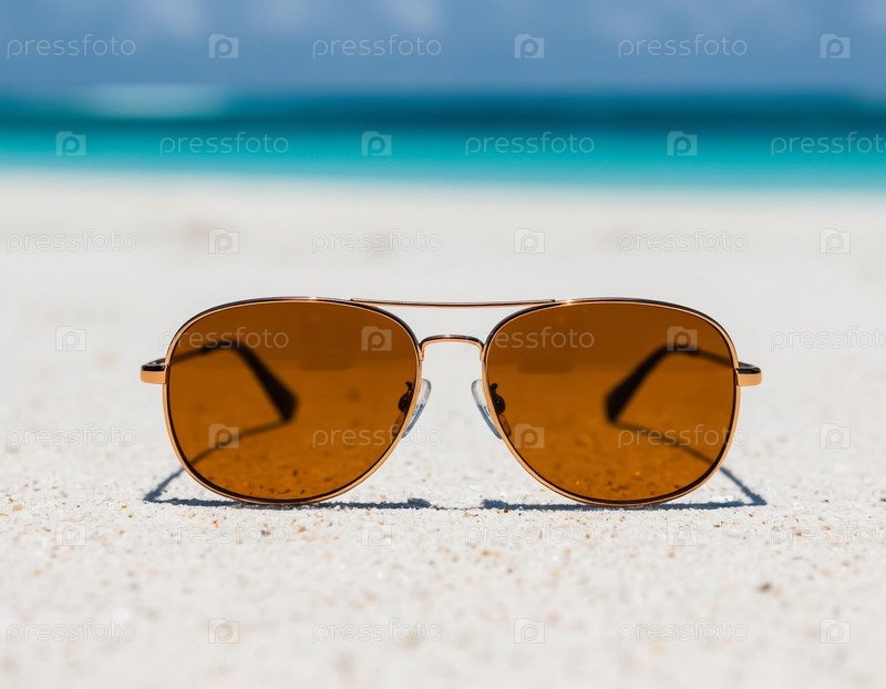 Поляризованные солнцезащитные очки на белом песчаном пляже