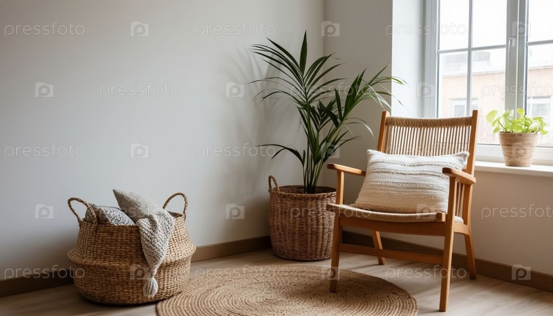 Уютный уголок ремесла в доме - стул и корзина с пряжей у окна