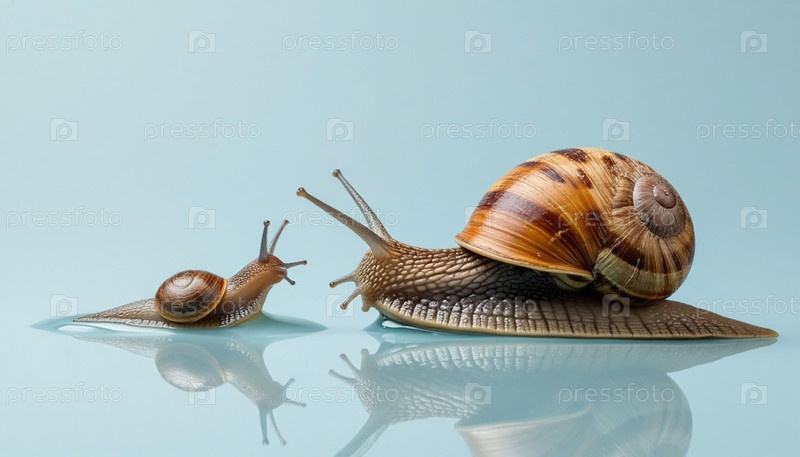 Две улитки мама и ребенок на капле воды на пастельно-серо-синем вертикальном фоне