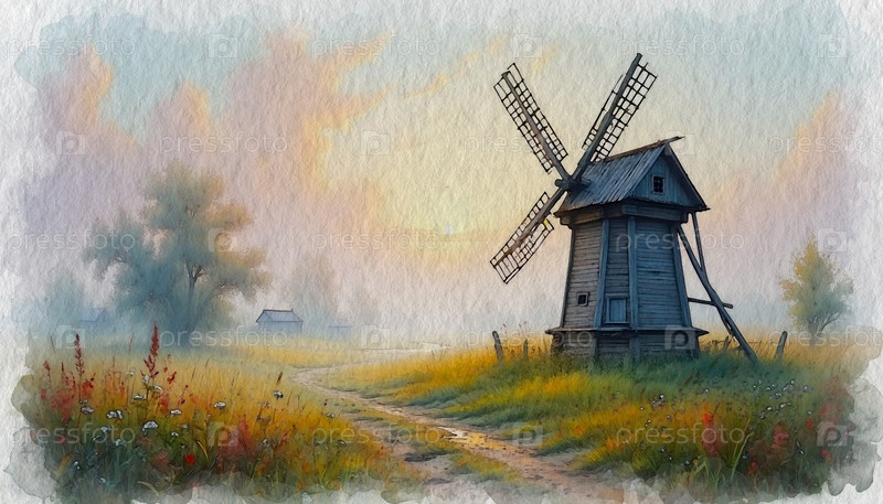 Утренний пейзаж с мельницей в тумане, акварель, созданная AI