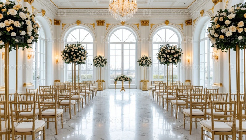 Роскошный дорогой интерьер с белыми и золотыми элементами