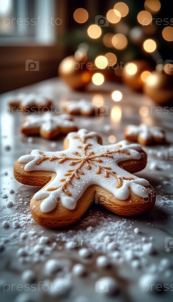 Рождественский имбирный торт с глазуркой на мраморе, сахар в порошке, вид сверху