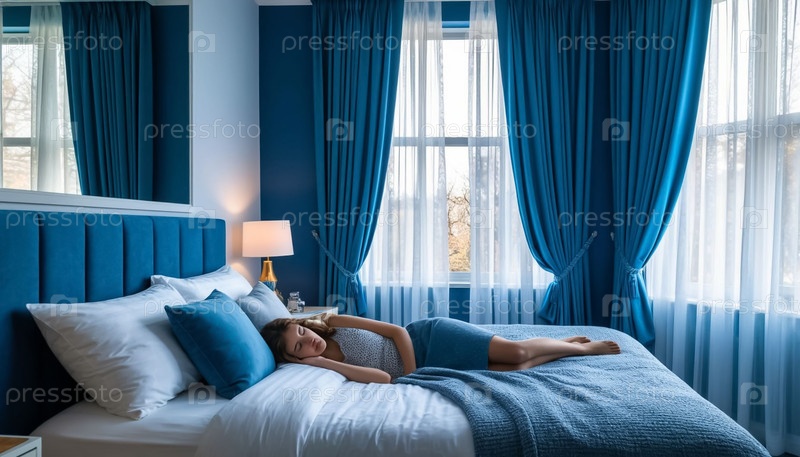 Интерьер спальни в синем и белом цветах с девушкой на кровати