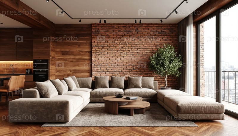 Современная гостиная, кирпичные стены, удобные диваны с подушками, панорамные окна. загородный коттедж, отель. генерация ИИ
