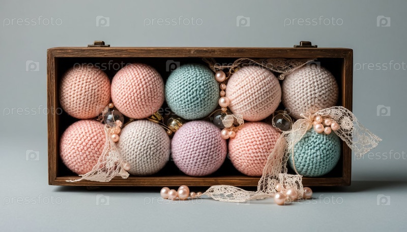 Пастельные вязаные шерстяные рождественские шары в стиле винтажного деревянного ящика. экологически чистые игрушки