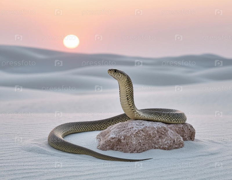 Змея в пустыне возле камня на белом песке на рассвете