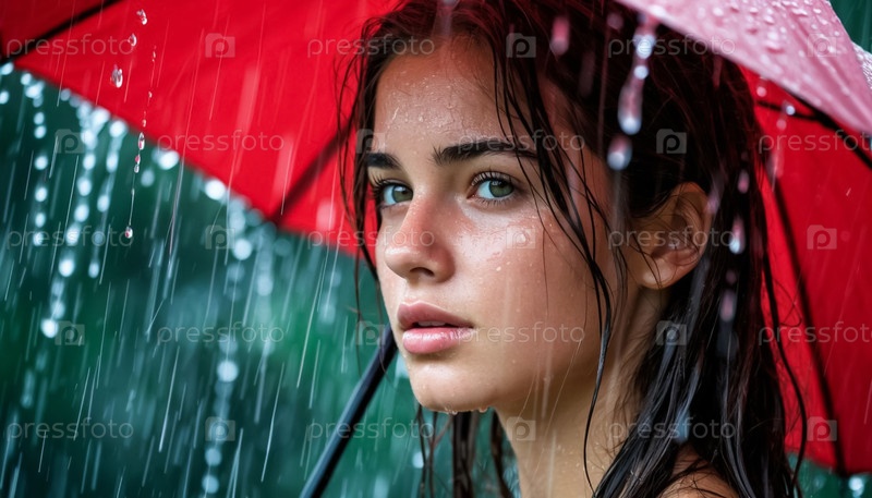 Портрет красивой девушки, мокрой от дождя под зонтиком