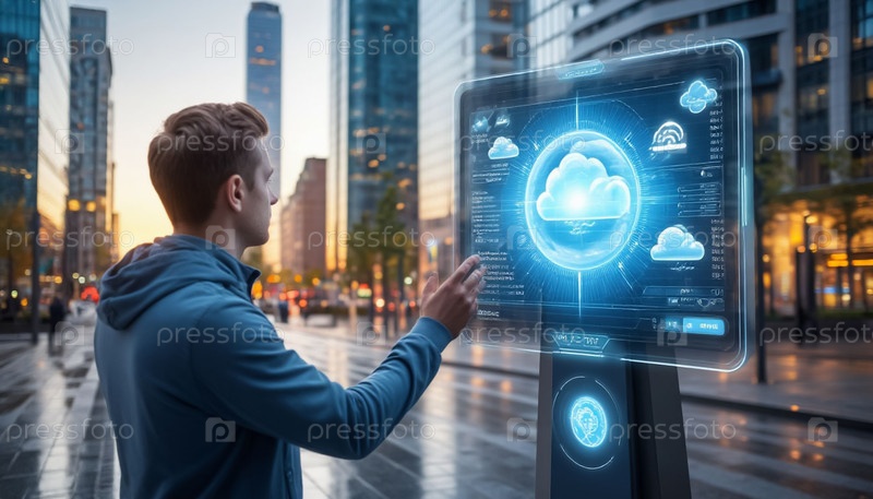 Человек, взаимодействующий с сенсорным экраном голографического контроля погоды в городе