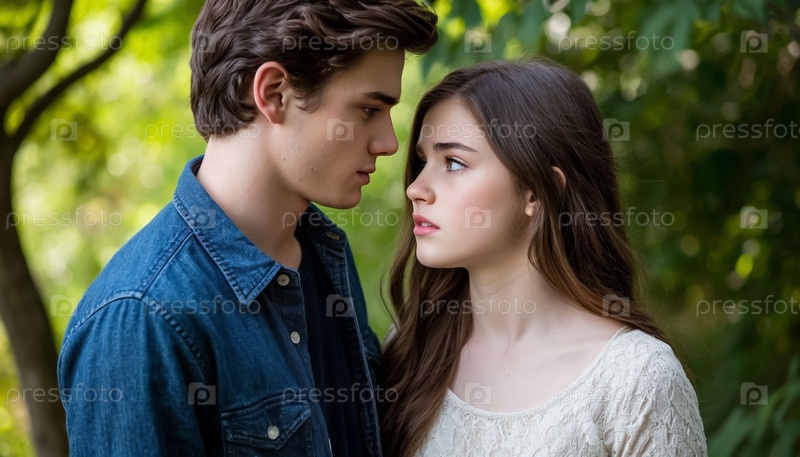Парень приближается к грустной девушке сзади, в борьбе или сложных отношениях