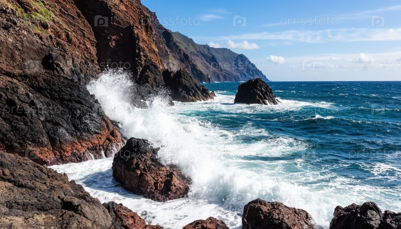 Жестокий морской пейзаж с высокими скалами на берегу