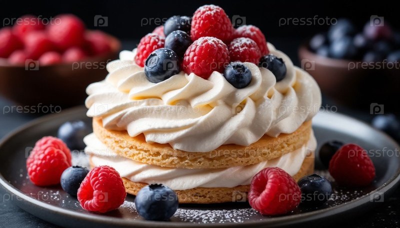 Воздушный торт со сливкой и ягодами на темном фоне