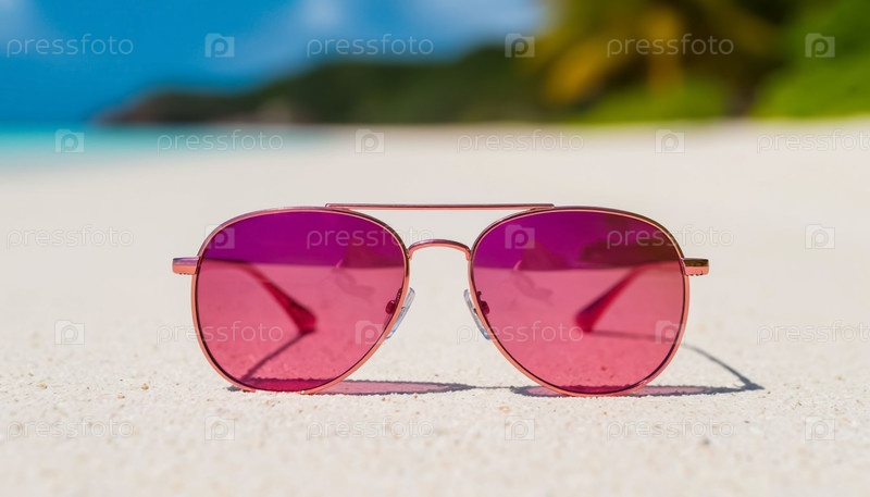 Розовые поляризованные солнцезащитные очки на белом песчаном пляже