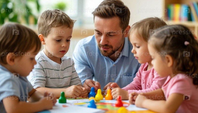 Мужской учитель в детском саду работает с детьми