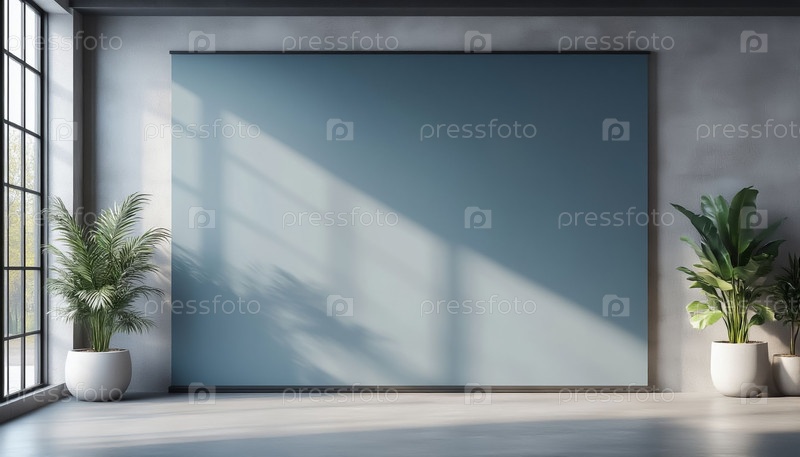 Серо-синяя пустая рама на стене в минималистической комнате с растениями