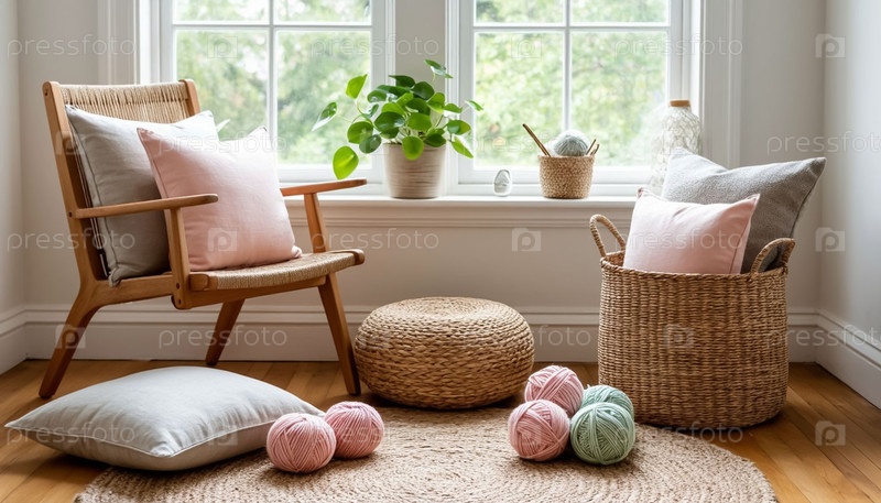 Уютный уголок ремесла в доме - стул и корзина с пряжей у окна