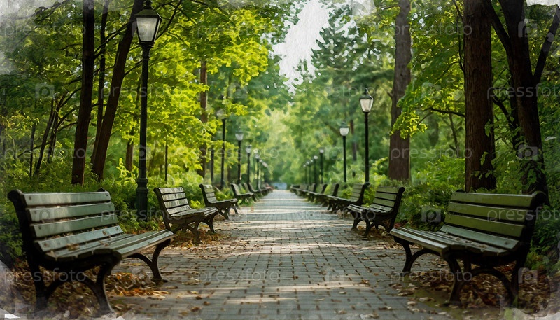 Парковая аллея и скамейки, акварельная иллюстрация, сгенерированная AI