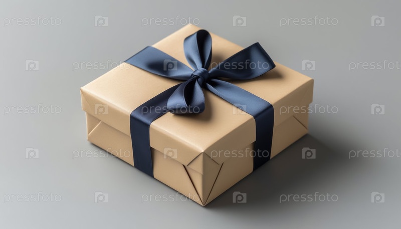 Подарок в упаковке с луком на нейтральном сером