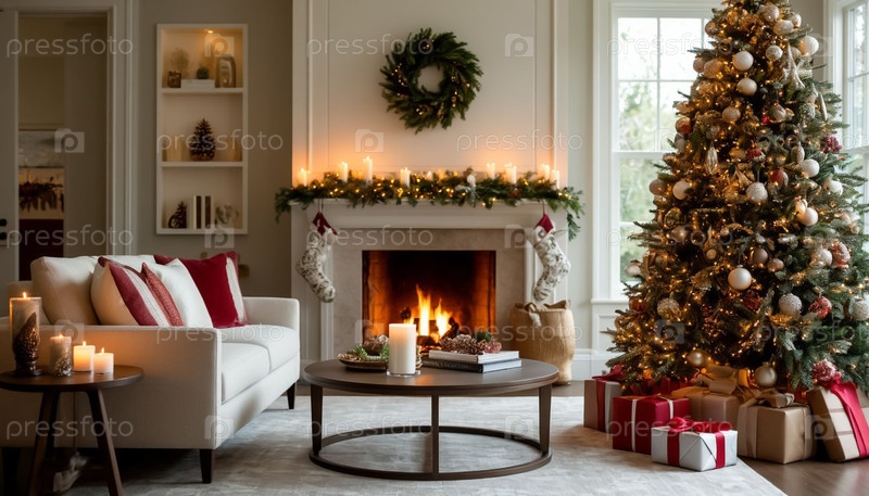 Роскошный интерьер рождественская гостиная, элегантно украшенный дом для отдыха